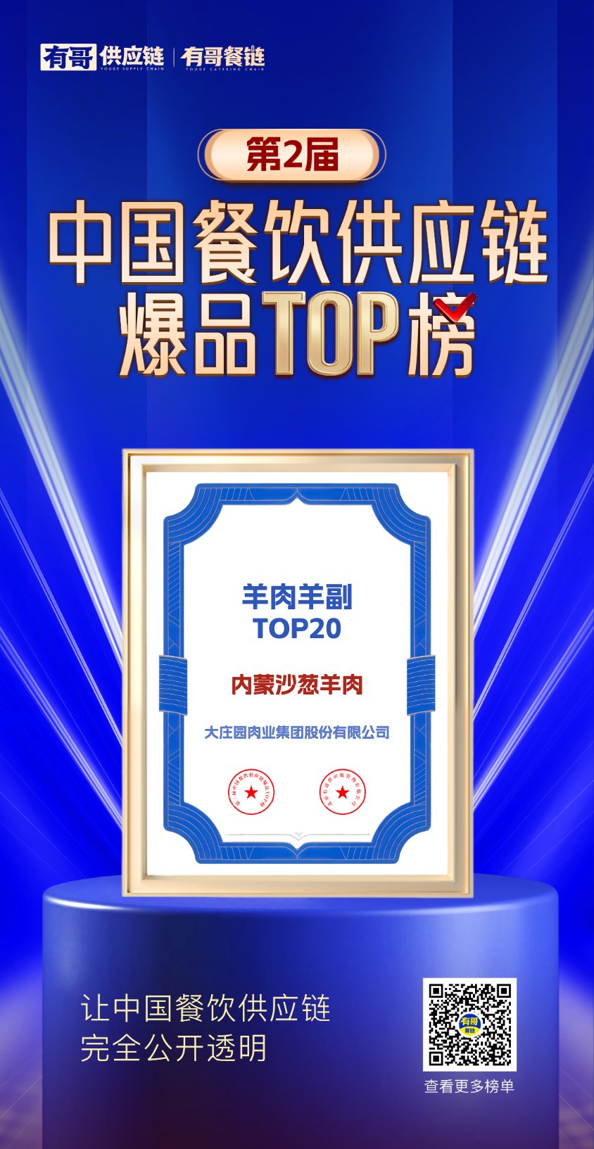 2025年10月22日,由有哥供應(yīng)鏈主辦的“第二屆中國餐飲供應(yīng)鏈爆品TOP榜”正式揭曉。大莊園集團旗下產(chǎn)品“內(nèi)蒙沙蔥羊肉”憑借卓越品質(zhì)與市場表現(xiàn),榮登羊肉羊副品類TOP20榜單。