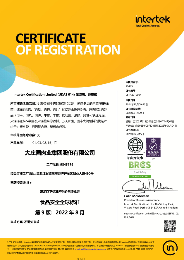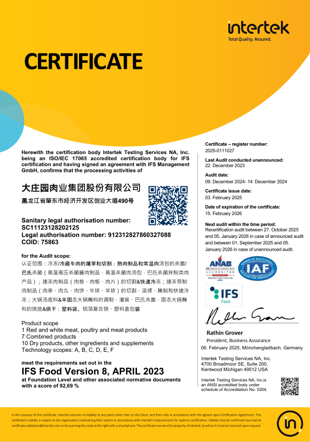 2021年1月,通過(guò)歐洲國(guó)際雙體系質(zhì)量認(rèn)證(BRCGS、IFS)。